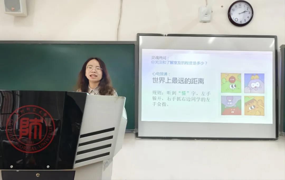 闫春艳首先强调了寝室长在大学生心理健康工作中的作用。她通过具体而生动的例子来讲解寝室长的工作职责和原则,并通过“世界上最远的距离”这一活动来启发大家在寝室里要时刻关注室友的行为变化,及时做好预防措施。
