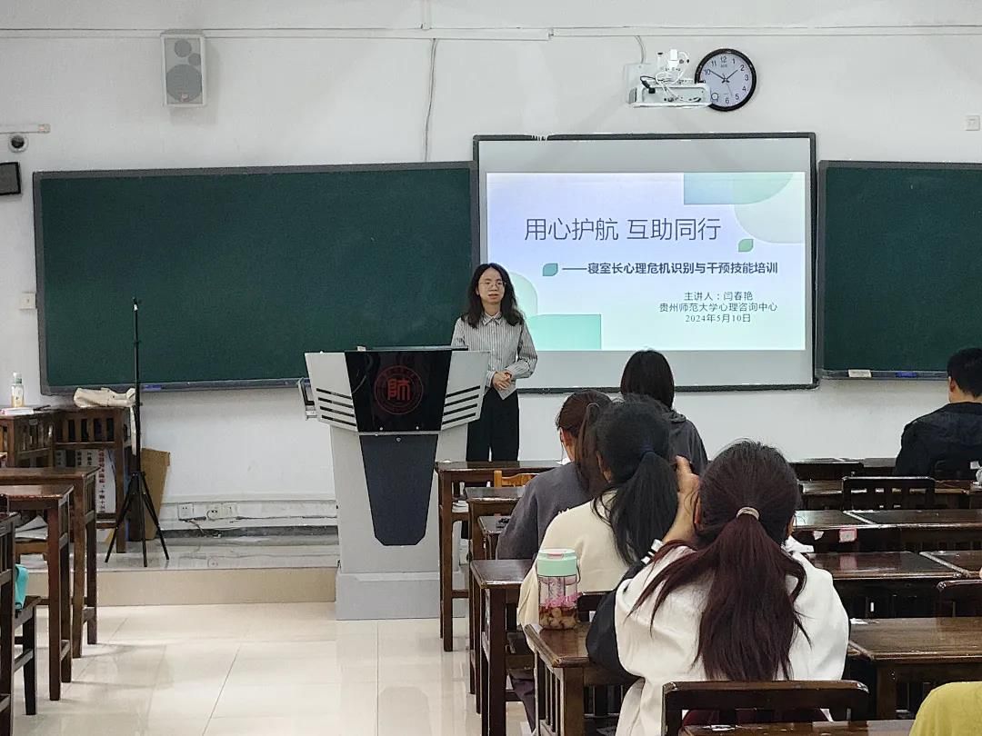 随着时代的发展,大学生心理已经成为社会所关注的重要问题。为提升心理委员、寝室长的心理健康意识,增长大学生心理健康知识,更好地发挥其作用。2024年5月10日下午,贵州师范大学文学院邀请心理健康教育与咨询中心咨询员闫春艳,在文学院6114教室开展了心理委员、寝室长心理健康知识培训活动,文学院2023级本科生全体心理委员、寝室长参加了培训。