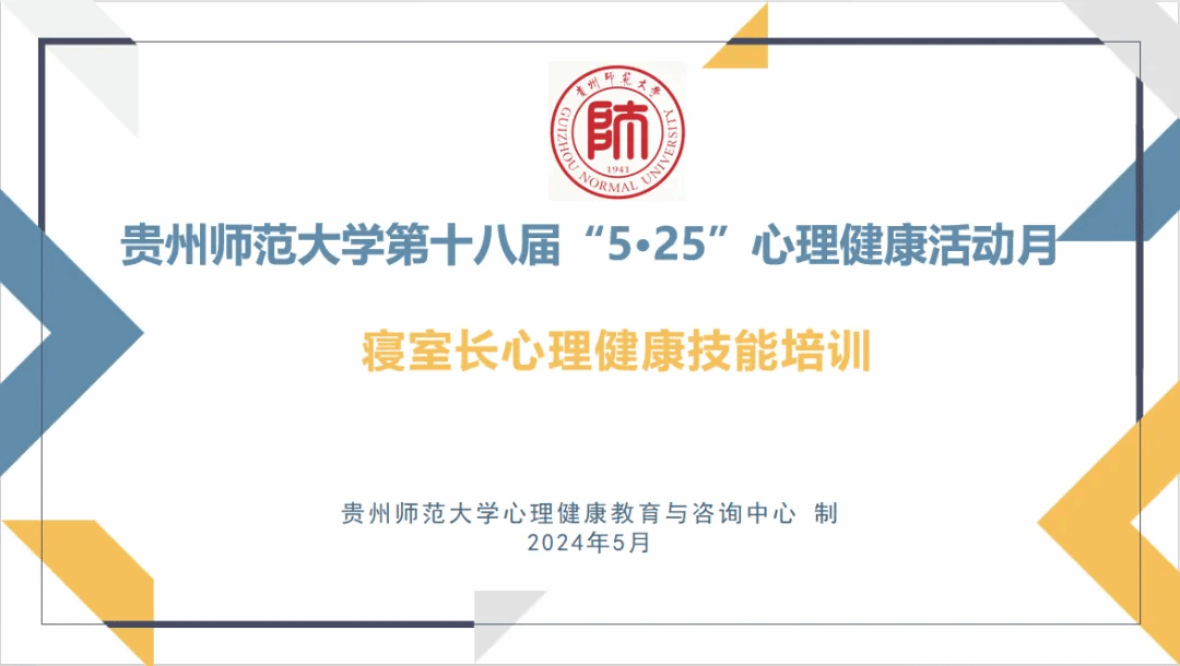 为全面落实“立德树人”根本任务,贯彻《全面加强和改进新时代学生心理健康教育工作专项行动计划(2023-2025)》,完善“校-院-班-寝”四级心理防御机制,将心理危机干预延伸至宿舍,发挥寝室长朋辈辅导作用。2024年5月10日至6月14日,心理健康教育与咨询中心在贵州师范大学第十八届“5·25”大学生心理健康活动月期间,面向全校2023级寝室长开展了24场心理健康技能培训活动,全校2000余名寝室长参与此次培训。