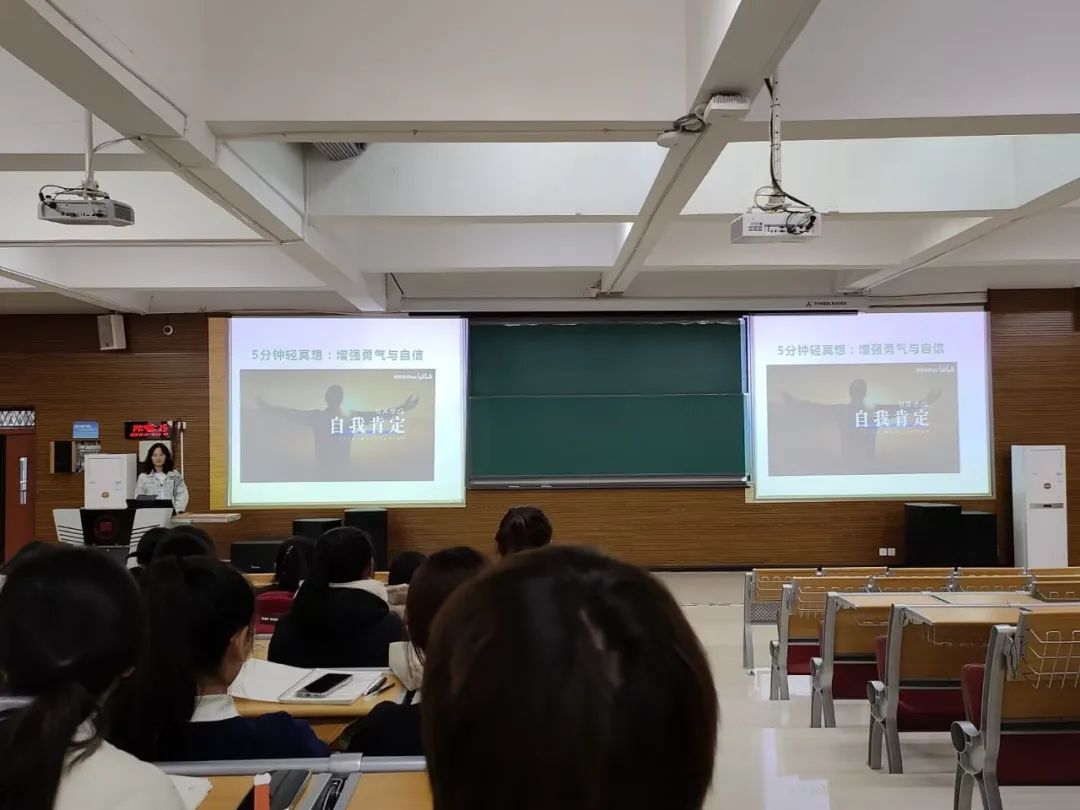 随后,杨郦晶列举出新生在入学之初普遍遇到的实际问题,并与同学们分享了几种缓解心理问题的方法途径,如观看心理电影,获得社会关爱支持及阅览心理学科普专栏等。在现场,杨郦晶与同学们共同体验了“5分钟轻冥想:增强勇气与自信”。