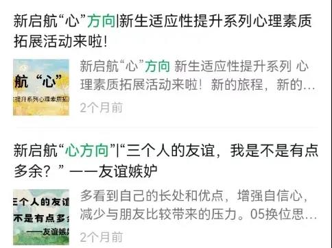 中心充分利用线上线下资源开展心理健康科普。线上平台方面,咨询中心官方网站设立心理科普专栏,定期更新文章;微信公众号推送《新启航"心"方向》系列科普,共发布文章10篇,总阅读量达3786人次。线下通过发放精心编制的心理健康服务手册26000余份,内容涵盖人际交往、爱情心理、沟通技巧等,在新生中广泛普及心理健康基础知识,有效提升了新生对心理健康的关注度与认知水平。