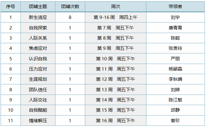 本学期的团辅活动主要分为短程和长程团体,包括人际交往、生涯规划、压力应对、认识自我等多个主题。