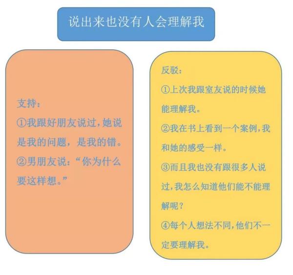 通过记录察觉自己不合理的想法后,可以把这个想法写在一张空白的纸中间,然后左边写上支持的证据,右边写上反驳的证据,列举如下: