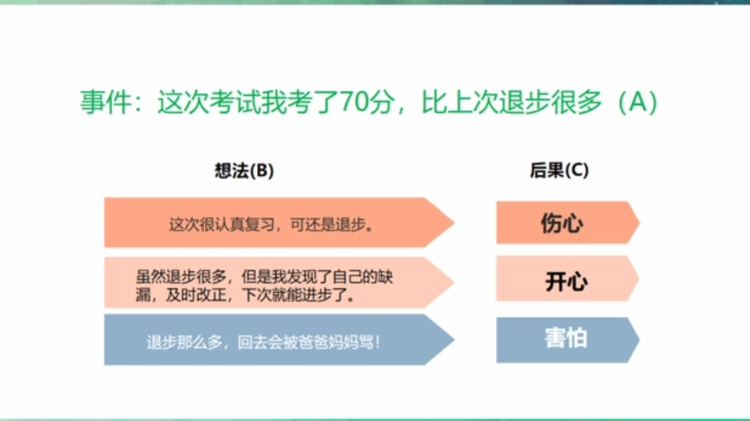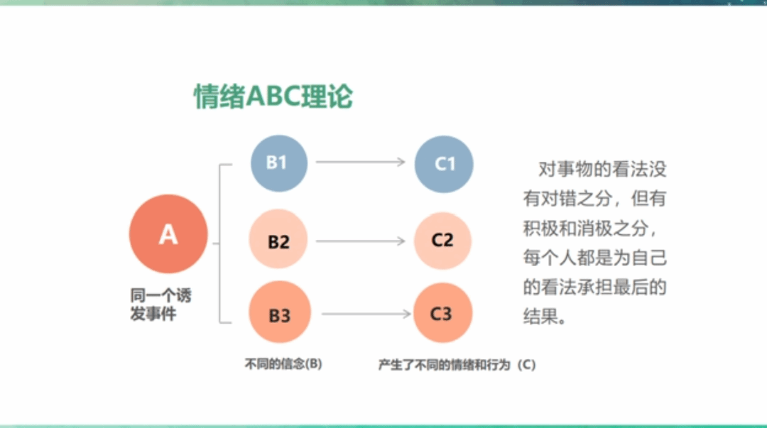 由此可知,对于同一个诱发事件A,会引发不同的想法或信念B1、B2或B3,不同的想法或信念产生了不同的情绪和行为C1、C2、C3。由此可知,我们对事物的看法没有对错之分,但有积极和消极之分。当有愤怒、恐惧等消极情绪产生时,可以尝试着找出不合理信念,重新调整对这件事的看法,调整认知后,我们的情绪和行为都会变得更积极。