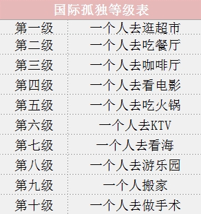 从求学时的班级集体学习到工作时的公司整体,从出生时的原生家庭到以后自己组建的家庭,我们一直在集体中生存着。对一个成年人来说,长大以后与家人和朋友同频的时段会越来越少,大家都有各自的生活,独处似乎已是必修课。很早之前民间就流传着一个孤独等级表,不知道现在的你在第几级呢。